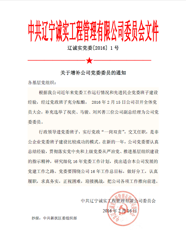 中共平博手机官方网站入口,平博(中国)委员会文件——关于增补公司党委委员的通知