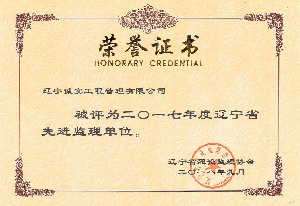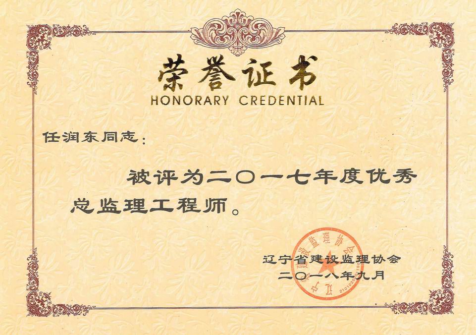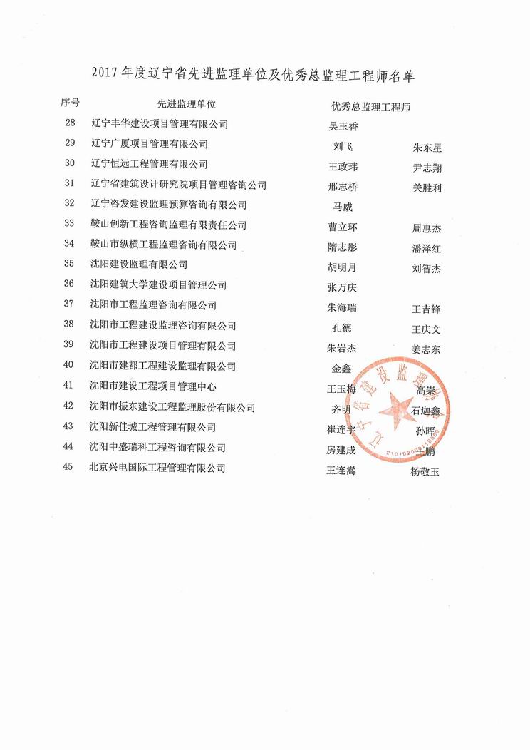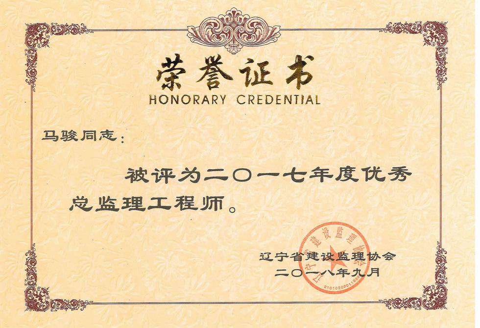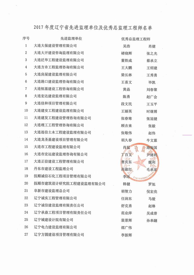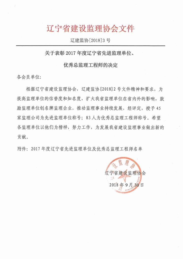 我公司被辽宁省建设监理协会评为2017年度辽宁省先进监理单位、任润东和马骏被评为优秀总监理工程师